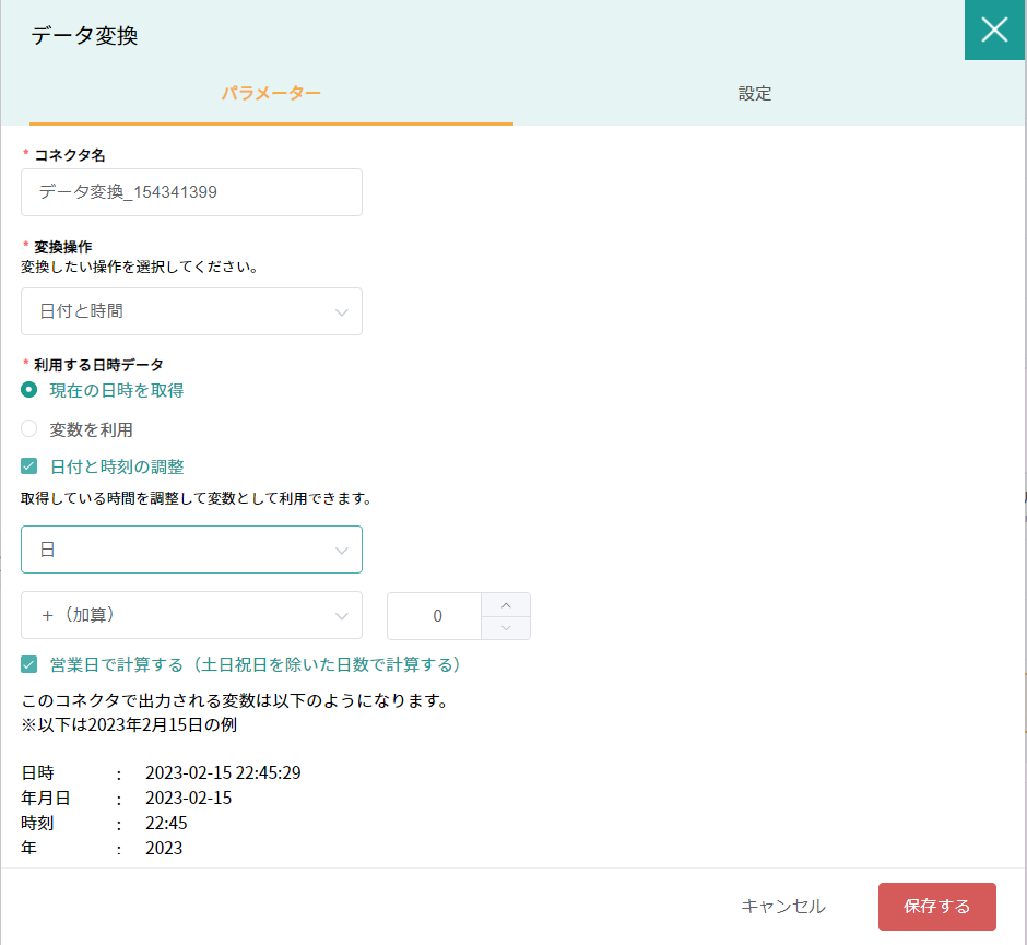 利用する日時データ | 〇 | ■現在の日時を取得 このコネクタを実行した日時を取得する ■変数を利用 前のコネクタで取得している日時を変数として利用する。 | |