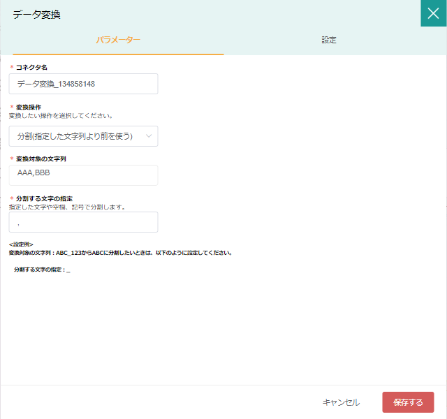 | 分割する文字の指定 | 〇 | 区切り対象の文字を指定 | 画像は「,」 |