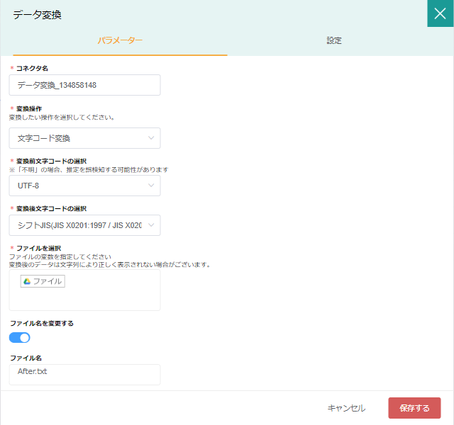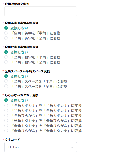 | 文字コード | ✕ | 変換対象の文字列の文字コードを指定 | 動作の仕様上、ほとんどの場合でUTF-8となります。 変数の中の文字種がShift-JISにしか存在しないなど、明確な場合に限りこの設定を利用してください。 |