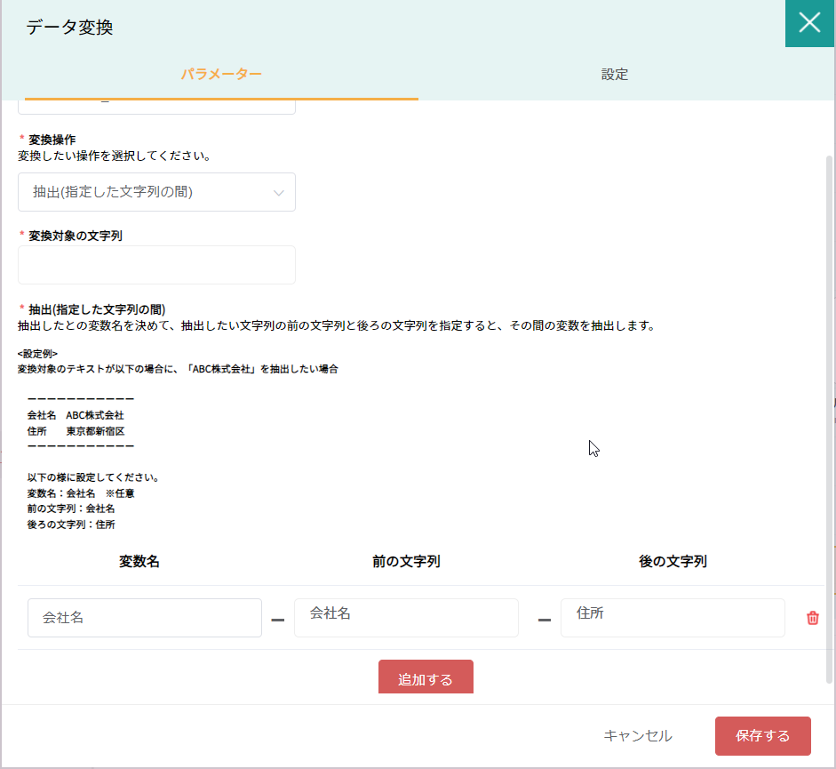 | 後の文字列 | 〇 | 抽出したい文字列の後を指定する。 |