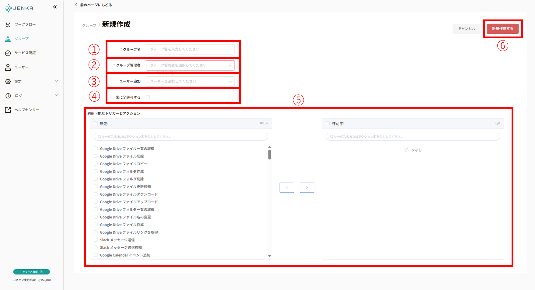 グループ 追加・削除 | グループに所属できるユーザーの追加・削除 | 利用アプリの選択 | 認証の追加 | ワークフローの追加・編集・削除 | ログ |