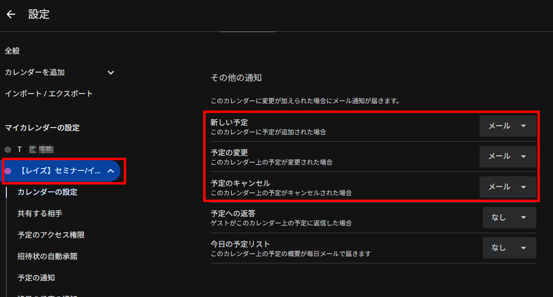 招待メールが届かない場合、[登録するカレンダーの設定>対象のカレンダーを選択>その他の通知]を確認してください。