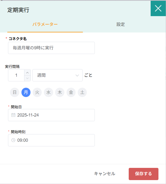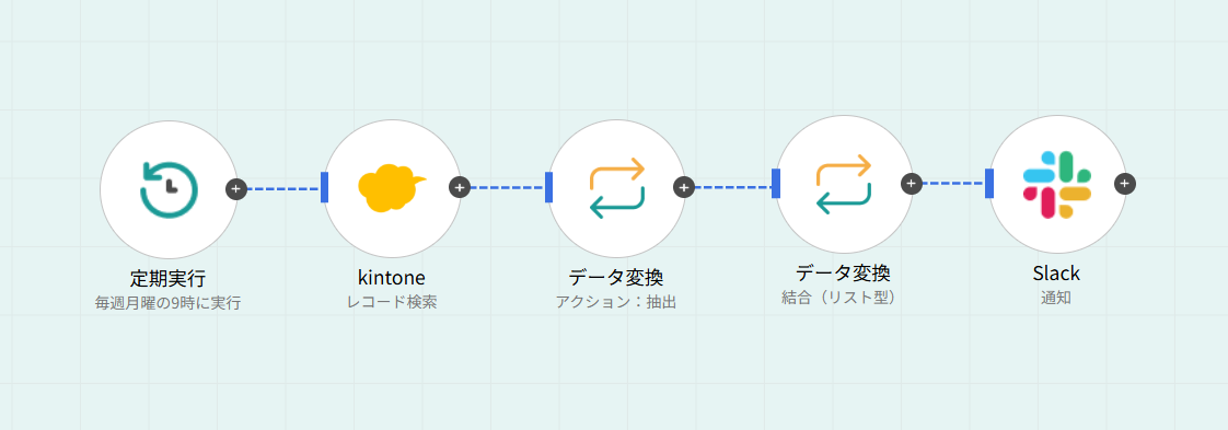 今回は「毎週月曜の9時に、先週1週間に更新があったkintoneのレコードを取得する」という定期実行を想定した設定を作成します。