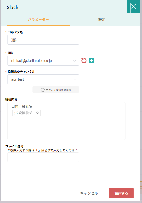投稿内容: 「日付/会社名」のテキストの下に5の変数 「変換後後データ」の変数を追加しています。