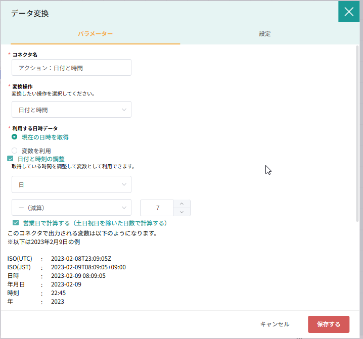 目的: kintoneの検索条件(先週1週間)を指定するために、現在の日付から7日前の日付を算出し、検索条件の開始日を動的に設定するための日付データを準備します。