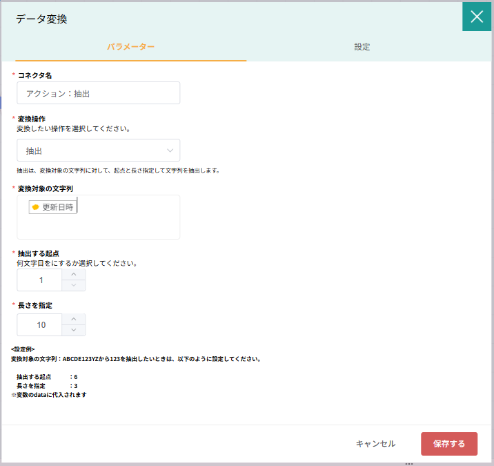 ・対応: データ変換コネクタの抽出アクションで、1文字目から10文字目までをリスト変数ごと指定します。