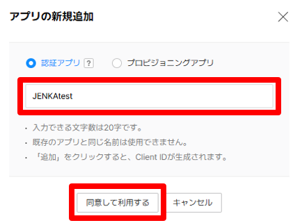 3. 認証用アプリを指定し、アプリの名前を入力の上[同意して利用する]をクリック