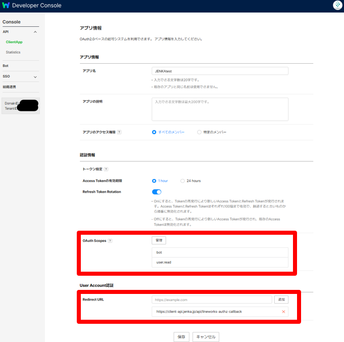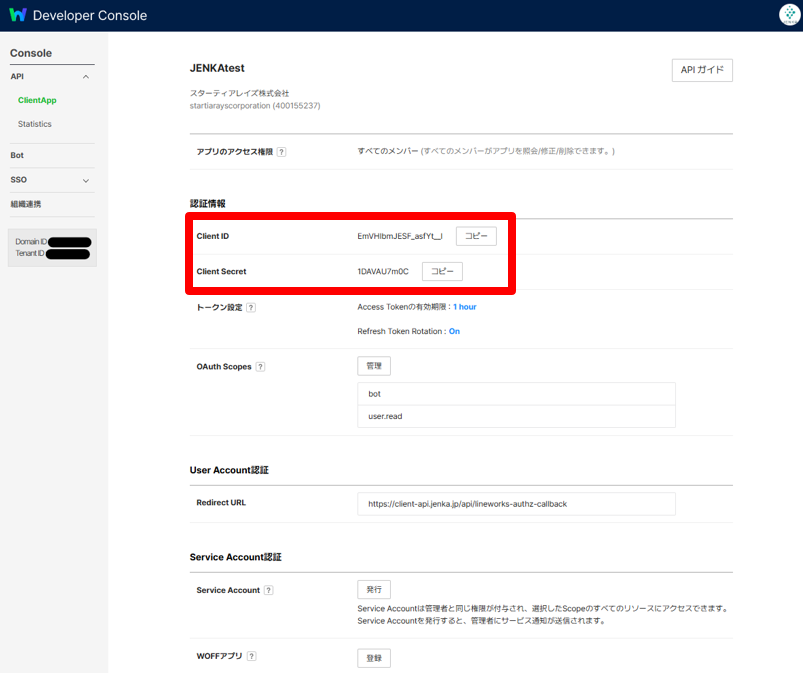 ※認証用アプリの作成については下記の「LINEWORKS Developeresで認証アプリを作成する手順」をご覧ください。