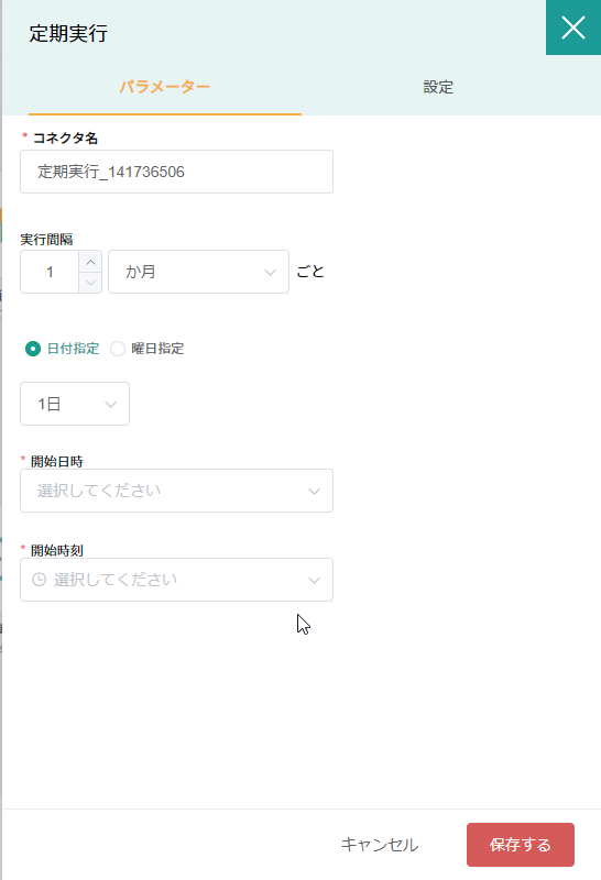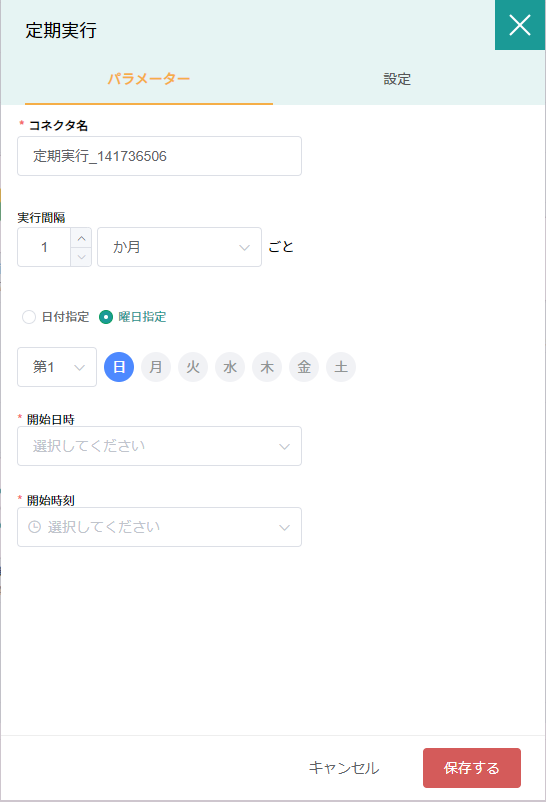 曜日選択 | ■日付指定の場合 日を選択する。 ■曜日指定の場合 曜日を指定する。 | 日付指定は、毎月〇日に実行するのような指定をする |