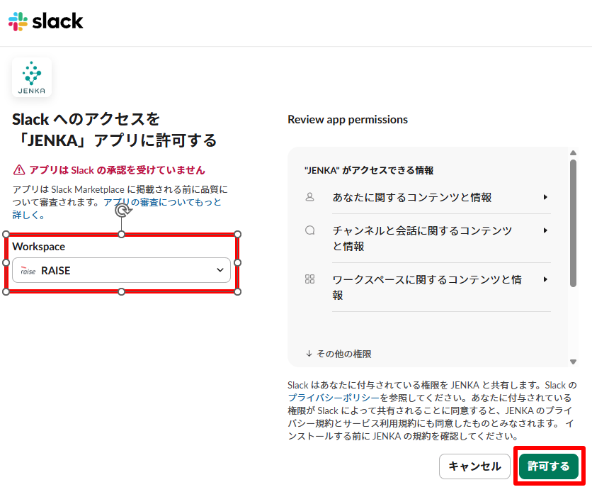 ※下記の場合、Slackの「JENKA」アプリが自動で、指定したワークスペースに追加されますが、