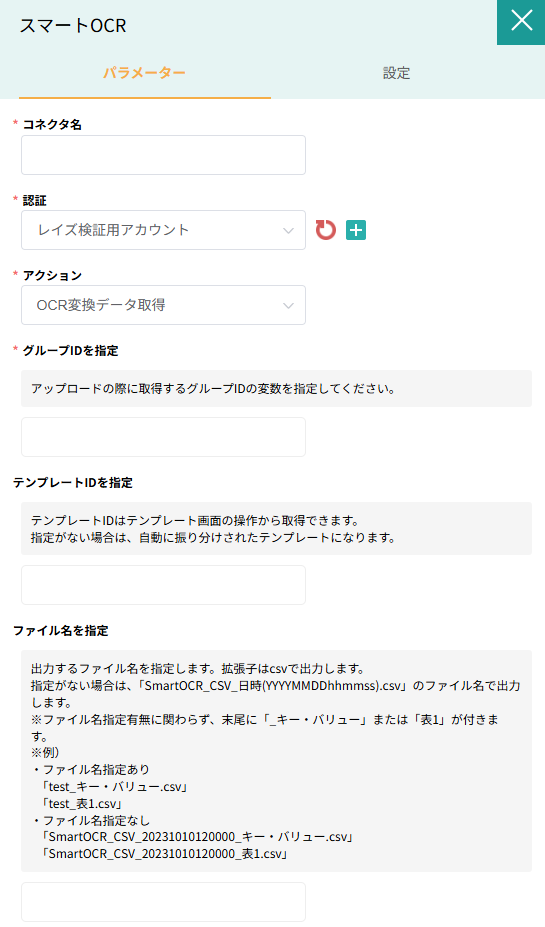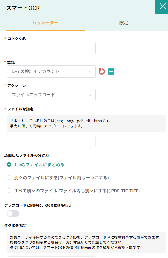 * アップロードと同時に、OCR依頼を行う ... チェックを有効にすると、このコネクタの実行後に自動でスマートOCR側でOCRが実行されます。手動で実行されたい場合はチェックを無効にしてください。