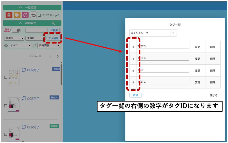 * タグIDを指定 ... OCR対象ファイルにタグを指定できます。タグはタグ名ではなく、タグIDの数字を指定します。タグIDは、スマートOCRのタグ編集の画面から確認が可能です(下記画像参照)