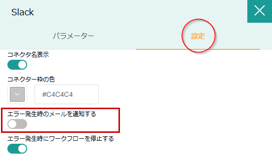 各コネクタの「設定」タブにある「エラー発生時のメールを通知する」をオフ(灰色)の状態にすることで、そのコネクタに起因するエラーでのメールを停止できます。