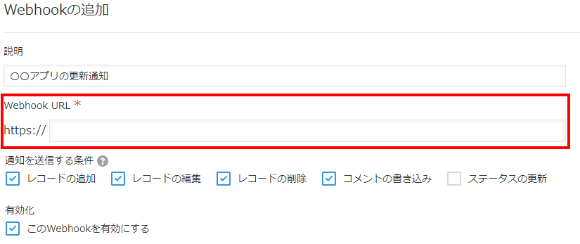 Webhookの利用については、Webアプリケーション側の設定などを行う必要があります。Webhookの設定方法は、Webアプリケーション側の設定手順を参照してください。